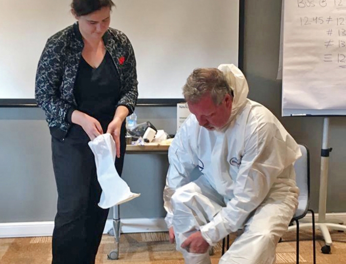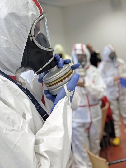 Lecturers Almira Geosev, from the Austrian Federal Ministry of Interior’s Civil Protection School, and Edward Waller, from the University of Ontario Institute of Technology, Canada, demonstrate how to use personal protective equipment to prevent possible contamination.