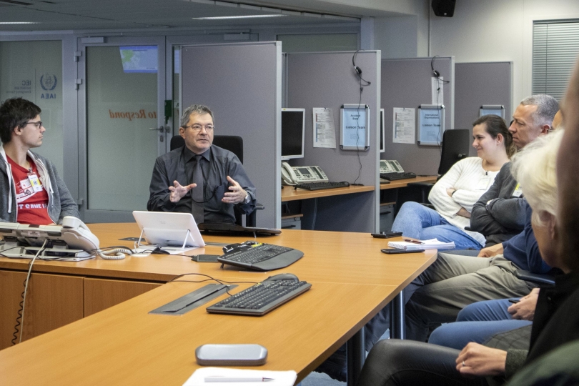 When the School is held in Austria, participants also visit the IAEA Incident and Emergency Centre to learn about how the IAEA works to help its Member States in emergency preparedness and response. Here, Florian Baciu, IAEA Response System Coordinator, briefs students in October 2018.