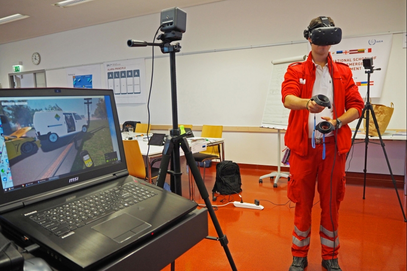 Some scenarios are better practiced virtually. The IAEA has developed virtual reality emergency scenarios in which participants practice emergency response actions. Here, an Austrian Red Cross representative practises how to respond to a traffic accident involving radioactive materials.