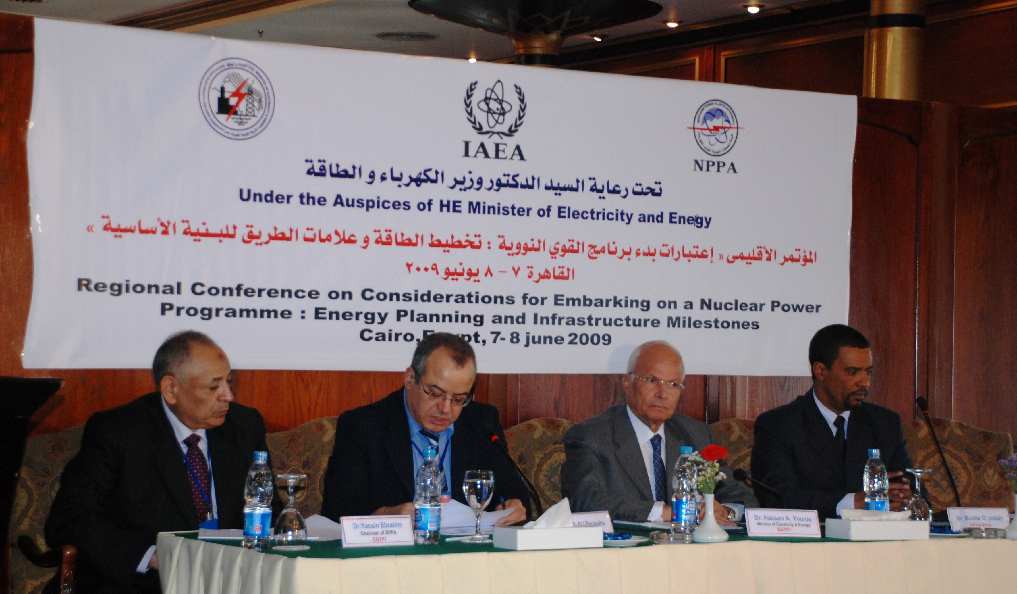 The African regional Conference on "Considerations for Embarking on Nuclear Power Programme" was held 7-8 June 2009 in Cairo, Egypt, in conjunction with two Regional Technical Cooperation Project Coordination Meetings (RAF/0/028 - Strengthening Planning Capabilities for Sustainable Energy Development (AFRA VI-1), and RAF/0/033 - Increasing Awareness at Decision Making Level about the Requirements and Challenges Related to the Feasibility of a Nuclear Power Programme). The Conference was organized by the International Atomic Energy Agency in cooperation with the Government of Egypt, through the Nuclear Power Plants Authority. The Conference was opened by H. E. Dr. Hassan Younis, Minister of Ministry of Electricity and Energy of Egypt. Dr. Moctar O. Yedaly, Representative of the African Union Commission (AUC) and Dr. Hussein Elhag, Executive Director of the African Energy Commission (AFREC) participated in this event which was attended by over 60 high ranking officials, experts and counterparts from the following African countries (Cameroon, Central African Republic, Chad, Eritrea, Ethiopia, Ghana, Cote d'Ivoire, Cote d'Ivoire, Democratic Republic of the Congo, Kenya, Libyan Arab Jamahiriya, Madagascar, Mauritius, Mali, Namibia, Niger, Nigeria, Senegal, Sierra Leone, Sudan, Tunisia, Uganda, United Republic of Tanzania, Zambia, and Zimbabwe). Keynote speakers were from the AUC, AFREC, France, Nigeria, Republic of Korea, South Africa, Tunisia, and the United States of America.