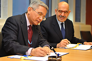 IAEA Director General Mohamed ElBaradei and Ambassador Saurabh Kumar of India sign the India Safeguards agreement, Vienna, Austria, 2 February 2009.